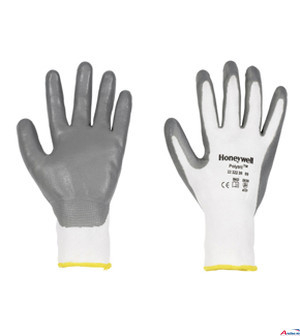 Polyamid-Strickhandschuh. Graue ölundurchlässige Nitrilbeschichtung in der Handfläche und an den Fingerspitzen. Elastisches Strickbündchen. CE, Kat. 2. EN 420, EN 388.