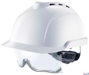 Kompakter, belüfteter Helm mit integrierter Überbrille. Premium Augenschutz durch innovatives Einstellsystem und einzigartiger Gummidichtung. Premium Komfort durch ausgewogene Konstruktion und neuartige Ratscheninnenausstattung Fas-Trac III. V-Gard 930 belüftet bietet Schutz vor fallenden Gegenständen, fliegenden Partikeln und UV-Strahlung.