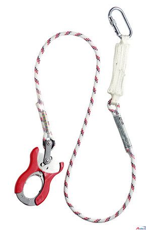 1,75 m langes einstellbares Verbindungsmittel mit Falldämpfer, Anschlagklemme für vertikale Gerüstrohre und Schraubverschlusskarabiner.