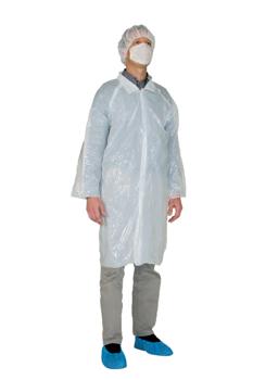 Material: PolyethylenFarbe: weissDicke: 20 MikronKragen: klassischVerschluss: 3 DruckknöpfeGrösse: EinheitsgrösseVerpackung: straffes GummibandVerpackung: Polybeutel mit 10 Mänteln